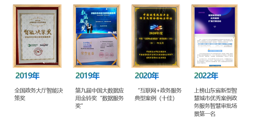 3、平台极具行业借鉴意义,荣获了全国政务大厅智能决策奖、第九届中国大数据应用金铃奖“数据服务奖”、互联网+政务服务典型案例(十佳)、山东省新型智慧城市优秀案例政务服务智慧审批场景第一名等多个国家级、省、市级的奖项。