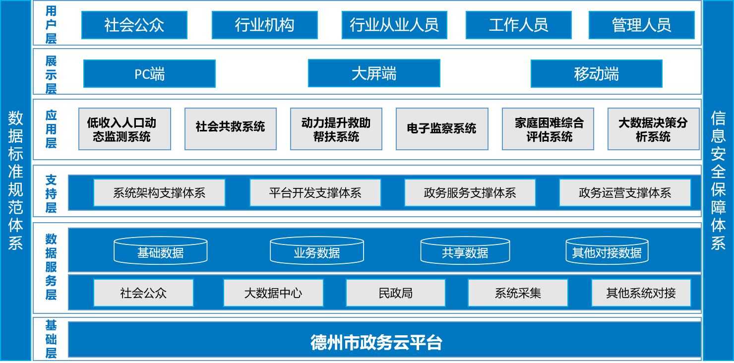 德州市社会大救助平台整体采用市区镇多级应用建设模式,从“服务+管理+监督+决策” 四个维度,建设了“一网三平台”(一网,是社会救助综合信息网;三平台,分别是德州市社会大救助综合服务平台、居民家庭经济状况核对平台、依托12345市民热线建立的呼叫平台)。通过以上内容建设,为困难群众、政府机构、社会慈善组织等提供业务办理、监测预警、预警分析等多项服务,实现救助全覆盖。