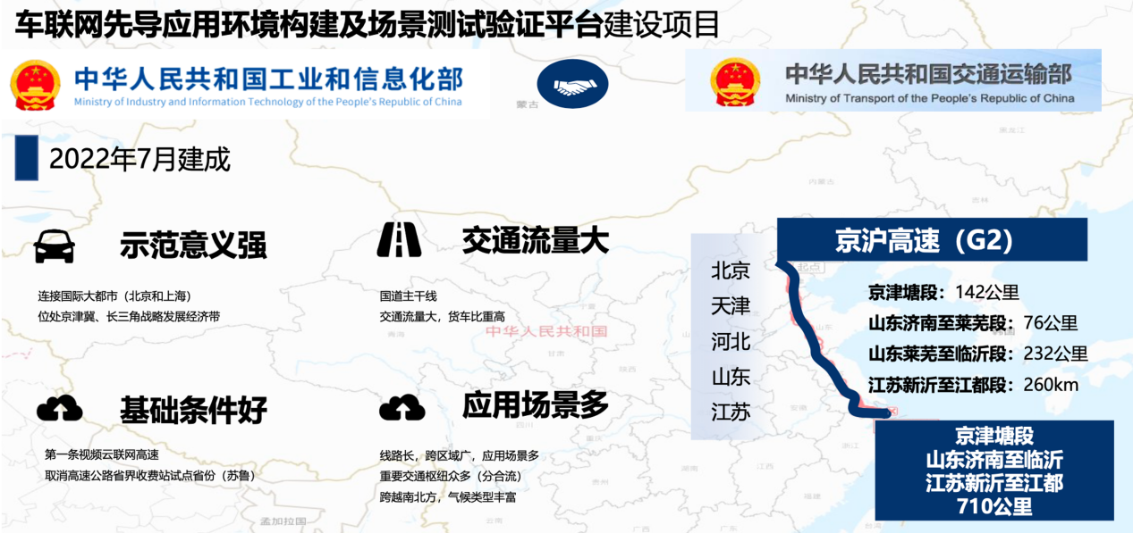 2020年产业技术基础公共服务平台—车联网先导应用环境构建及场景测试验证平台建设项目是工业和信息化部为加快完善产业技术基础体系,提升工业基础能力,保障产业创新发展和行业质量提升设立的国家课题项目。该项目由交通部路网中心牵头9家单位组成的联合体承建,以“贯通京沪高速、赋能干线物流”为目标,基于5.9GHz车路协同频段,重点打造“分合流安全预警及诱导场景”、“隧道安全预警及诱导场景”、“准全天候辅助通行场景”、“车道级差异化服务场景”等应用场景,建设国内首条车路协同示范高速公路,促进交通安全,提升出行效率。