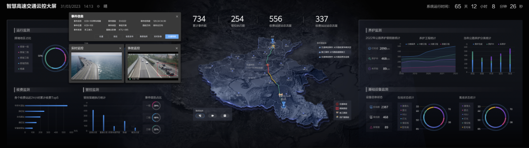 “高速交通管控协调系统”运用大数据、数字孪生等技术,以云控可视大屏服务引擎的方式助力高速运管者全面掌握整体道路、基础设施、运行监测、收费管理、机电运维状态、路产管理、养护管理、生产管控、交通气象等方面的信息;通过“交通仿真”,实现动态交通管控策略的制定,科学高效地提高行车安全和道路利用率;针对存在安全驾驶风险路段、大流量、恶劣天气、交通事故等场景,“协同管控”模块通过信号系统、可变信息标志、车路协同设备等相应的发布设备进行车道交通流管理、调节和诱导,最大程度兼顾安全与效率。