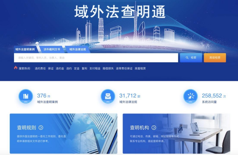 “域外法查明通”平台拥有域外法查明案例、涉外法律法规两大法律数据库,集案例检索、法律检索、统计分析三大功能于一体,并链接权威查明机构,引入域外法查明规则及操作指引,实现域外法“一站式”低成本、高效率查明。该平台曾于2022年获最高人民法院高度肯定,入选广东省法院“抓示范促改革惠民生”优秀改革项目,2023年入选《广东省推进粤港澳大湾区规则衔接机制对接典型案例》。