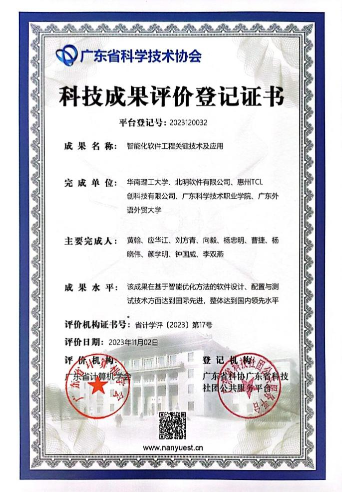 近年来,我国软件产业市场增长迅速,但同时也面临着关键核心技术基础薄弱的问题,自中美贸易战以来,国家十分重视国产软件尤其是工业软件的研制,加速软件国产替代,提升国产软件核心竞争力已成大势所趋。本次获奖项目《智能化软件工程关键技术及应用》基于国产信创背景,针对现有智能化软件工程技术存在的高代价、低效率、高复杂等问题,提出了三大技术目标:一是提出了基于多目标多约束优化的神经网络架构搜索方法,解决了软件需求文本分类需要充分预训练的高代价问题,克服了神经网络搜索方法难以满足软件需求场景多目标与约束要求的困难;二是提出了基于启发式复杂优化的软件自动配置方法,解决了同类方法配置组合覆盖率低的难题;三是提出了基于启发式黑盒优化的软件自动测试方法,解决了同类方法程序路径覆盖率低、无源码软件测试难度大等问题。项目所取得的技术突破获得广东省计算机学会科技成果评价委员会的一致认可,认定该成果在需求文本分类准确率、配置选项的 2-wise 组合覆盖率、程序路径覆盖率等性能指标方面相比国内外同类方法有明显优势,在基于智能优化方法的软件设计、配置与测试技术方面已达到国际先进、国内领先水平。