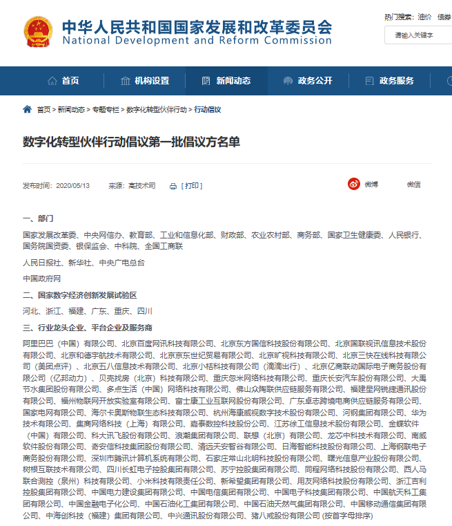 5月13日,国家发展改革委官网发布“数字化转型伙伴行动”倡议(以下简称倡议),并发布”第一批倡议方名单“。倡议由国家发展改革委联合有关部门、国家数字经济创新发展试验区、媒体单位,以及互联网平台、行业龙头企业、