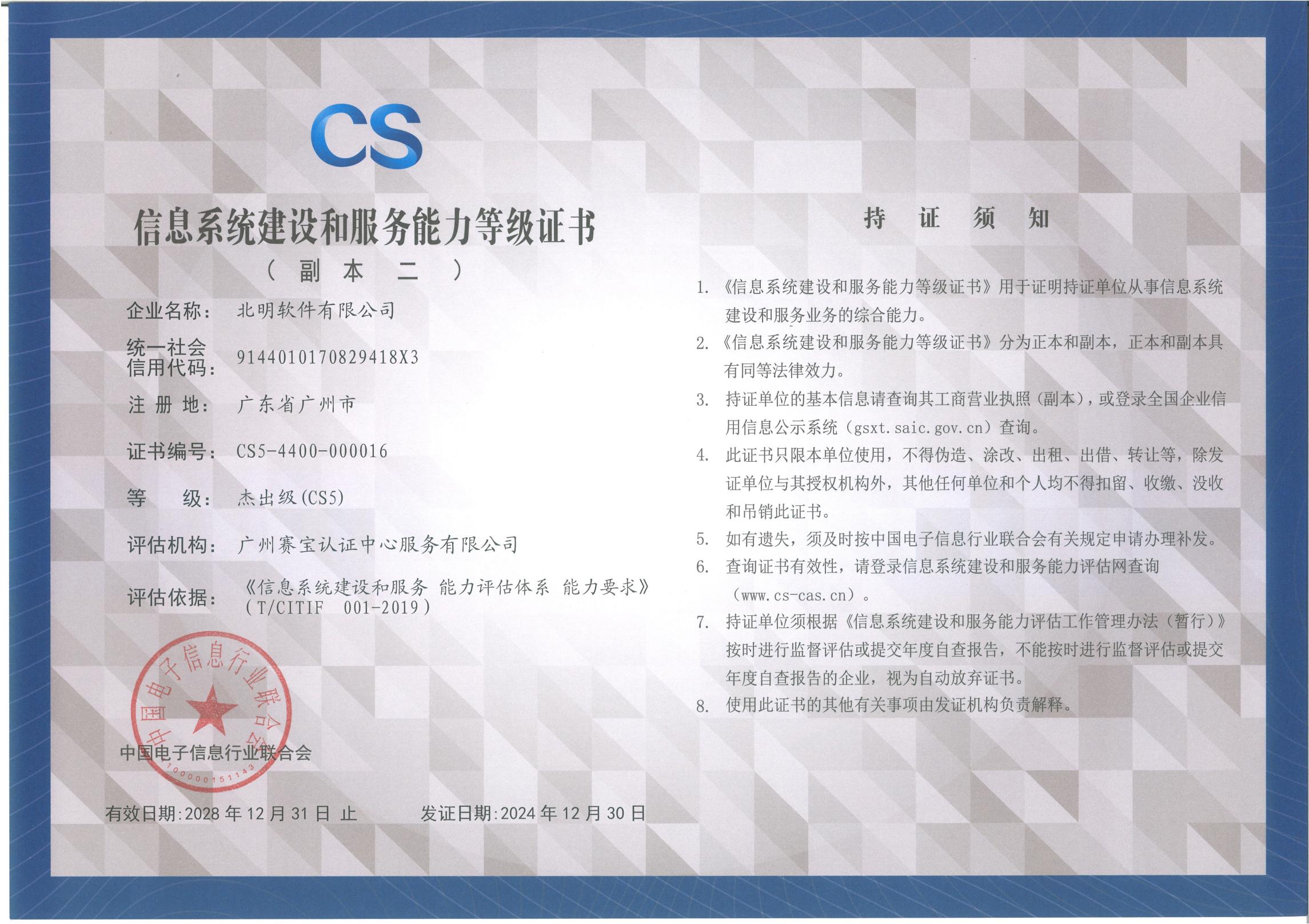 12月23日,信息系统建设和服务能力贯标企业评估结果正式公示,北明软件有限公司(简称:北明软件)凭借卓越的技术实力、成熟的服务运维体系以及丰富的实践经验,成功通过中国电子信息行业联合会的严格评审,荣获“全国首批信息系统建设和服务能力杰出级(CS5)企业”资质。此项资质全国仅有29家企业入选,其中,广东只有2家企业入围。