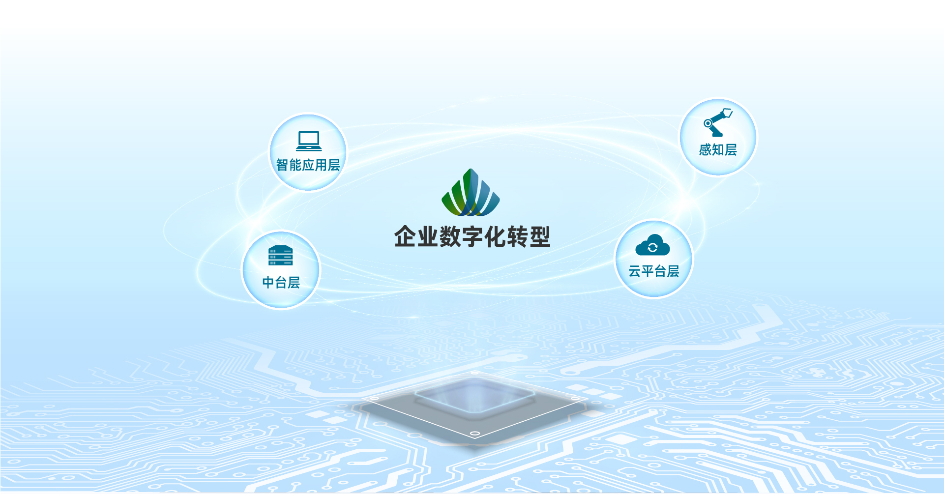以运营管理中心建立智能应用层、中台层、云平台层和感知层四大作业平台 形成有效的服务闭环,完成八大层面的数字化转型服务