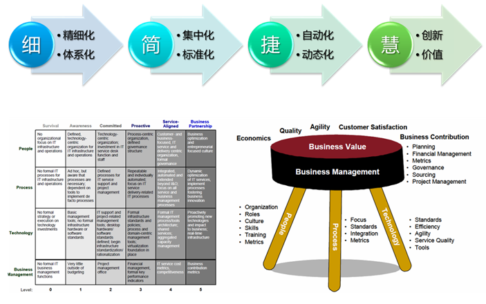 北明软件的IT服务管理咨询,目标不仅是为企业构建IT服务管理体系,而且会依据Gartner IOMM(Gartner IT基础架构及成熟度模型)帮助企业IT成熟度提升,实现"细""简""捷""慧"的持续进化。